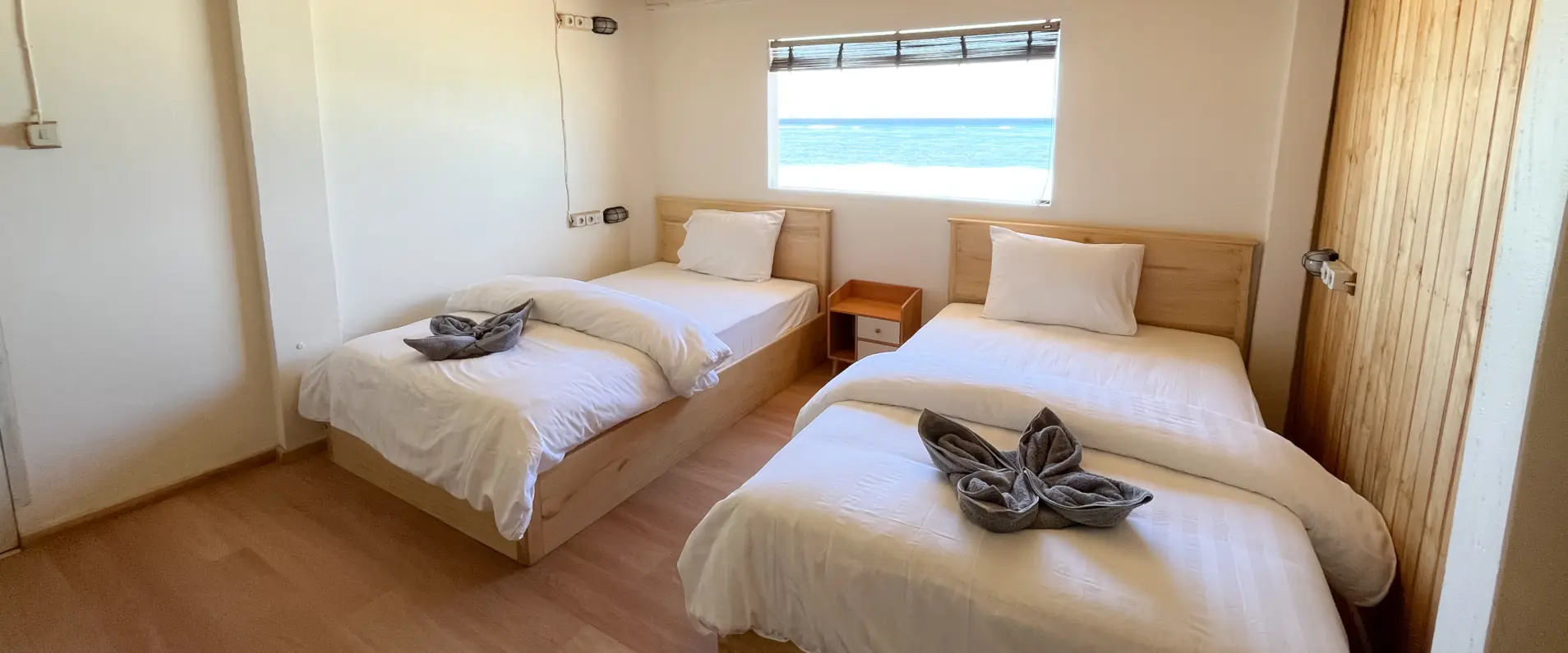 Our Family Room is the most spacious room at Phinisi Hostel Bira and ideal for families or small groups. It features a comfortable double bed, air-conditioning, and enough space to add an extra mattress if needed. A private ensuite bathroom with hot-water shower and a private sea view balcony complete the experience for a relaxed stay in Bira.
